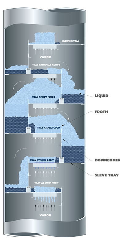 Typical transition from one to two pass tray (Depicts 90° rotation of two pass side downcomer tray below one pass tray w/ transition seal pan)
